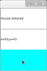 package sup.orange.learn; import java.awt.*; import java.awt.event.MouseEvent; import java.awt.event.MouseListener; import java.awt.event.WindowAdapter; import java.awt.event.WindowEvent; /** * Created by re-x on 11/2/14. */ public class MouseEventDemo extends Frame { Panel panel; TextField textfield1, textfield2; public MouseEventDemo () { super(); init(); } public static void main(String[] args) { new MouseEventDemo(); } public void init() { setLayout(new GridLayout(3, 1)); textfield1 = new TextField(30); textfield2 = new TextField(); add(textfield1); add(textfield2); panel = new Panel(); panel.setBackground(Color.CYAN); add(panel); panel.addMouseListener(new MouseListener() { @Override public void mouseClicked(MouseEvent e) { textfield2.setText("x="+e.getX()+";y="+e.getY()); } @Override public void mousePressed(MouseEvent e) { textfield1.setText("mouse pressed"); } @Override public void mouseReleased(MouseEvent e) { textfield1.setText("mouse released"); } @Override public void mouseEntered(MouseEvent e) { textfield1.setText("mouse entered"); } @Override public void mouseExited(MouseEvent e) { textfield1.setText("mouse exited"); } }); addWindowListener(new WindowAdapter() { @Override public void windowClosing(WindowEvent e) { super.windowClosing(e); dispose(); System.exit(0); } }); setSize(200, 300); setVisible(true); } }