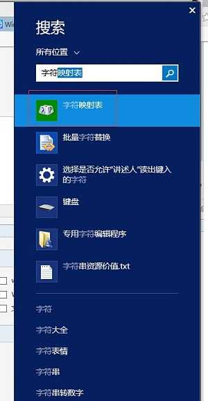 1)在 win8.1 系统的 “超级按钮” 中搜索选项中,输入“字符”,打开 “字符映射表” :