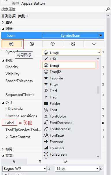 在 xaml 中,选中app bar 中的按钮,F4 打开属性对话框,在 Symbol 下拉框中,有很多