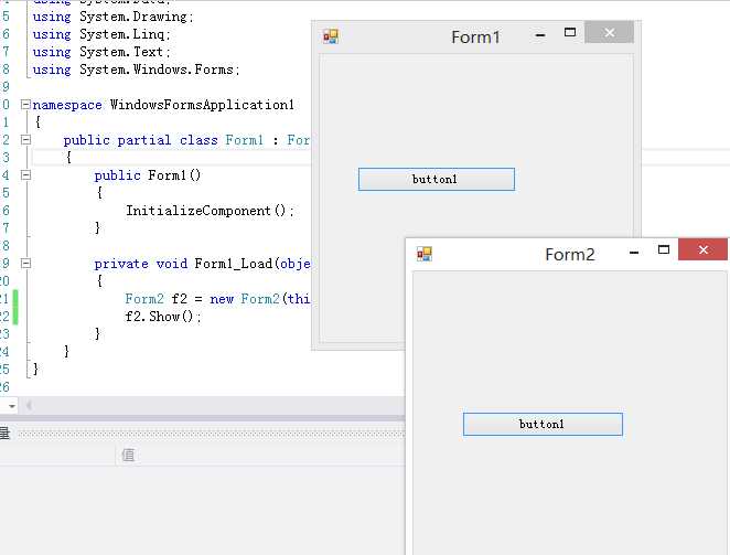 1 public Form1() 2 { 3 InitializeComponent(); 4 } 5 6 private void Form1_Load(object sender, EventArgs e) 7 { 8 Form2 f2 = new Form2(this); 9 f2.Show(); 10 }