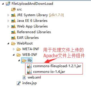 创建一个FileUploadAndDownLoad项目,加入Apache的commons-fileupload文件上传组件的相关Jar包,如下图所示: