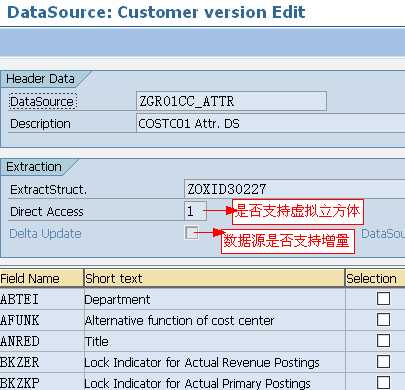 注:自建数据源只支持Pull方式的增量方式(所以与财务模块数据源一样也不支持删除),因为我们不可能像为LO后勤数据源那样,给它们用推的方式主动向Delta-Queue里存增量数据,因为推的方式需要在数据源端使用代码来实现的。而Pull的方式则会简单很多,它是基于某个字段来筛选出发生变化的数据来的。