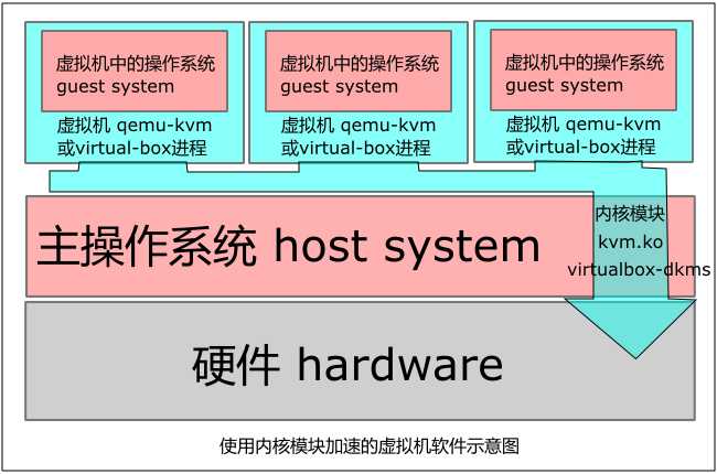 很显然,这种完全以软件模拟硬件的形式虽然功能强大,但是性能难以满足用户的需要。模拟出的硬件的性能和物理硬件的性能相比,必然会大打折扣。为了提高虚拟机软件的性能,开发者们各显神通。其中,最常用的办法就是在主操作系统中通过内核模块开一个洞,通过这个洞将虚拟机中的操作直接映射到物理硬件上,从而提高虚拟机中运行的操作系统的性能。如下图: