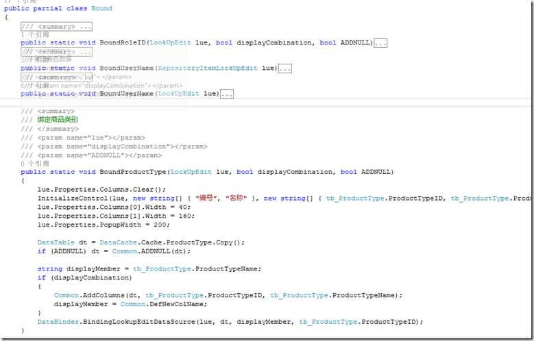 /// <summary> /// 绑定商品类别 /// </summary> /// <param name="lue"></param> /// <param name="displayCombination"></param> /// <param name="ADDNULL"></param> public static void BoundProductType(LookUpEdit lue, bool displayCombination, bool ADDNULL) { lue.Properties.Columns.Clear(); InitializeControl(lue, new string[] { "编号", "名称" }, new string[] { tb_ProductType.ProductTypeID, tb_ProductType.ProductTypeName }); lue.Properties.Columns[0].Width = 40; lue.Properties.Columns[1].Width = 160; lue.Properties.PopupWidth = 200; DataTable dt = DataCache.Cache.ProductType.Copy(); if (ADDNULL) dt = Common.ADDNULL(dt); string displayMember = tb_ProductType.ProductTypeName; if (displayCombination) { Common.AddColumns(dt, tb_ProductType.ProductTypeID, tb_ProductType.ProductTypeName); displayMember = Common.DefNewColName; } DataBinder.BindingLookupEditDataSource(lue, dt, displayMember, tb_ProductType.ProductTypeID); } /// <summary> /// 绑定商品类别 /// </summary> /// <param name="lue"></param> /// <param name="displayCombination"></param> /// <param name="ADDNULL"></param> public static void BoundProductType(CheckedComboBoxEdit lue, bool displayCombination, bool ADDNULL) { DataTable dt = DataCache.Cache.ProductType.Copy(); if (ADDNULL) dt = Common.ADDNULL(dt); string displayMember = tb_ProductType.ProductTypeName; if (displayCombination) { Common.AddColumns(dt, tb_ProductType.ProductTypeID, tb_ProductType.ProductTypeName); displayMember = Common.DefNewColName; } DataBinder.BindingCheckedComboBoxSource(lue, dt, displayMember, tb_ProductType.ProductTypeID); }