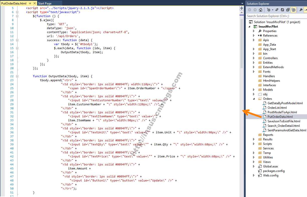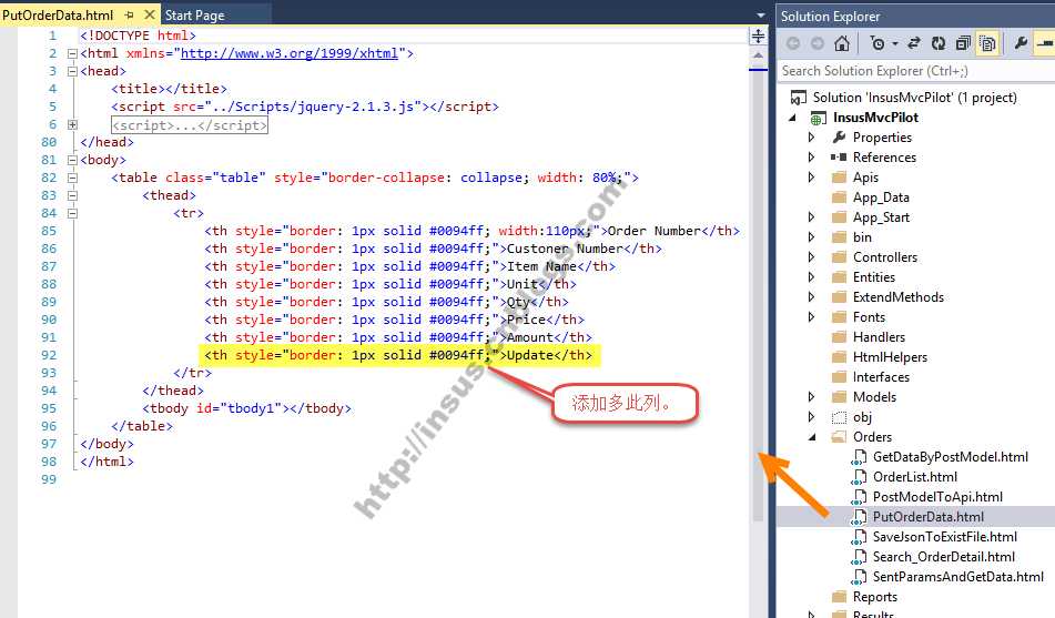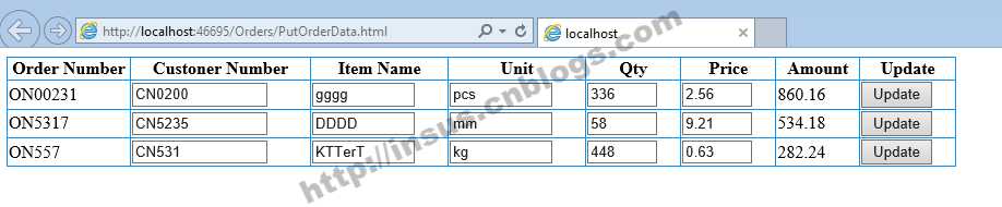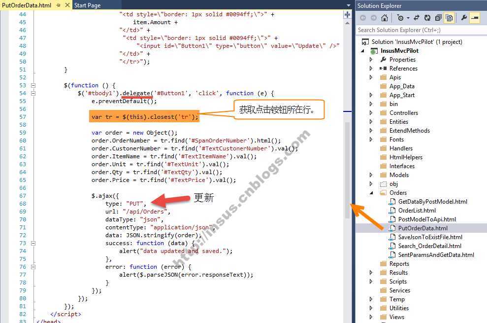 下面我们可以写Update铵钮的事件,这里有一点需要注意的就是这个铵钮是动态产生的,我们处理它的Click事件时,得使用jQuery的delegate委托,有关jQuery的事件处理更多参考《jQuery动态产生的铵钮怎样实现事件处理》http://www.cnblogs.com/insus/p/4315984.html