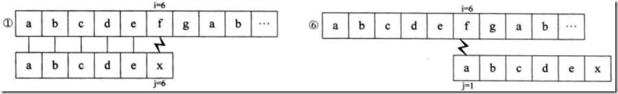 主串s=“abcdefgab”模式串p=“abcdex”,也就是上面的图中所示的问题。对于这个例子不难发现,模式串的首字母“a”与后面的串“bcdex”中的任意一个字符都不相等,那么对于①中所示的那样,前五位字符分别与主串匹配成功。也就是说模式串的首字符“a”不可能与主串的第2位到第5位的字符相等。也就是说②③④⑤的判断是多于的。所以只需要保留①⑥就可以了。