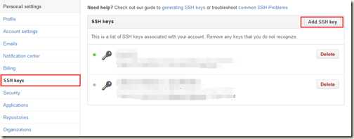 点击"Setting"图标,然后在"Personal settings"栏中选择"SSH keys"选项卡,并点击其右上角的"Add SSH key",