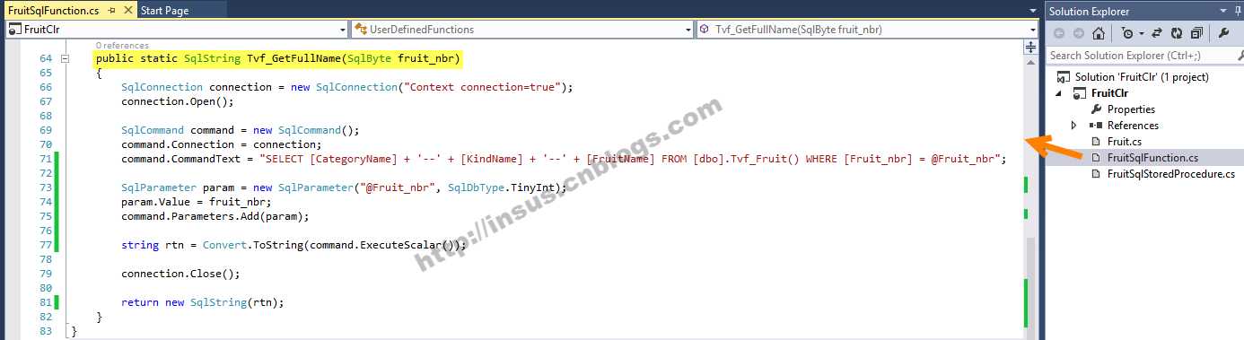 [SqlFunction(DataAccess = DataAccessKind.Read)] public static SqlString Tvf_GetFullName(SqlByte fruit_nbr) { SqlConnection connection = new SqlConnection("Context connection=true"); connection.Open(); SqlCommand command = new SqlCommand(); command.Connection = connection; command.CommandText = "SELECT [CategoryName] + ‘--‘ + [KindName] + ‘--‘ + [FruitName] FROM [dbo].Tvf_Fruit() WHERE [Fruit_nbr] = @Fruit_nbr"; SqlParameter param = new SqlParameter("@Fruit_nbr", SqlDbType.TinyInt); param.Value = fruit_nbr; command.Parameters.Add(param); string rtn = Convert.ToString(command.ExecuteScalar()); connection.Close(); return new SqlString(rtn); }