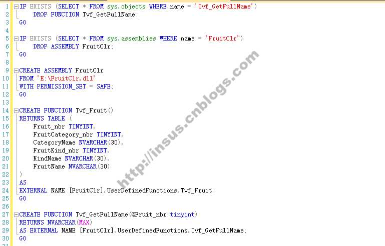IF EXISTS (SELECT * FROM sys.objects WHERE name = ‘Tvf_GetFullName‘) DROP FUNCTION Tvf_GetFullName; GO IF EXISTS (SELECT * FROM sys.assemblies WHERE name = ‘FruitClr‘) DROP ASSEMBLY FruitClr; GO CREATE ASSEMBLY FruitClr FROM ‘E:\FruitClr.dll‘ WITH PERMISSION_SET = SAFE; GO CREATE FUNCTION Tvf_Fruit() RETURNS TABLE ( Fruit_nbr TINYINT, FruitCategory_nbr TINYINT, CategoryName NVARCHAR(30), FruitKind_nbr TINYINT, KindName NVARCHAR(30), FruitName NVARCHAR(30) ) AS EXTERNAL NAME [FruitClr].UserDefinedFunctions.Tvf_Fruit; GO CREATE FUNCTION Tvf_GetFullName(@Fruit_nbr tinyint) RETURNS NVARCHAR(MAX) AS EXTERNAL NAME [FruitClr].UserDefinedFunctions.Tvf_GetFullName; GO