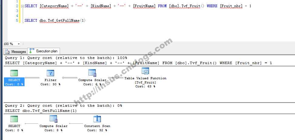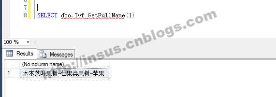 SELECT [CategoryName] + ‘--‘ + [KindName] + ‘--‘ + [FruitName] FROM [dbo].Tvf_Fruit() WHERE [Fruit_nbr] = @Fruit_nbr