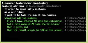 在一台安装好Cucumber的机器上,执行上述測试用例,便能够看到下列输出: