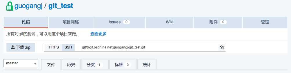 “git@git.oschina.net:guogangj/git_test.git”这个地址可以在项目主界面上得知: