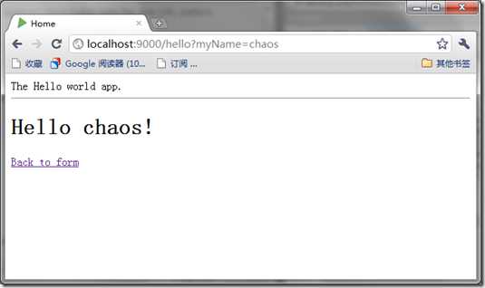 我们使用@{…}符号请求Play自动产生调用Application.sayHello动作的方法。刷新浏览器。