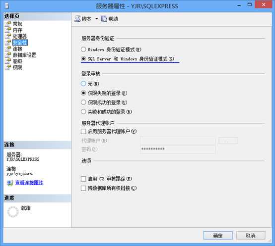 3.在安全性中选中右侧的“SQL Server 和 Windows 身份验证模式”以启用混合登录模式