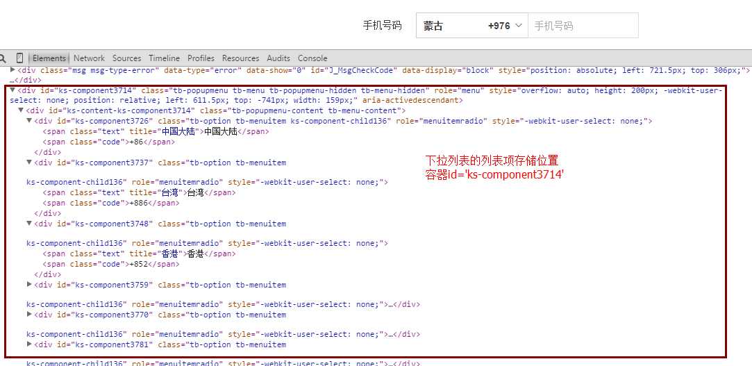 通过 Chrome 打开网页链接后,点击手机号码所在地下拉列表,随便选一个地区,然后按 F12 查看源码,可以非常容易的定位到下拉列表显示的元素,如下图所示: