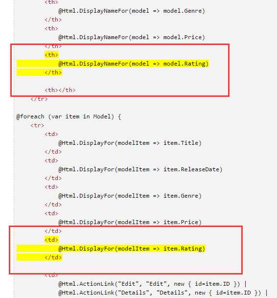 Open the \Views\Movies\Index.cshtml file and add a <th>Rating</th> column heading just after the Price column. Then add a <td> column near the end of the template to render the @item.Rating value. Below is what the updated Index.cshtml view template looks like: