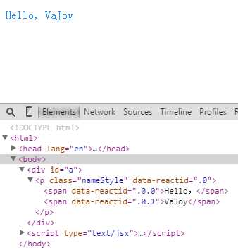var name = ‘VaJoy‘; React.render(<h1>{name}</h1>, document.getElementById(‘a‘));
