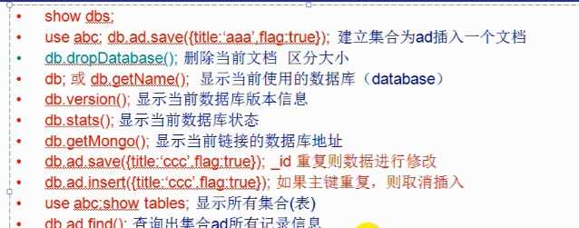db.集合名.save({sanem:‘李四‘,sage:18,saddress:"郑州"});