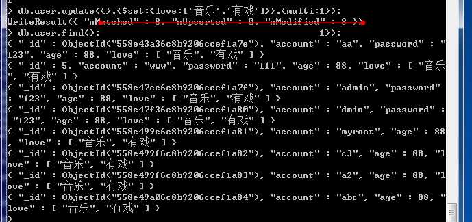 > db.user.update({},{$set:{love:[‘音乐‘,‘有戏‘]}},{multi:1});