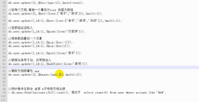 > db.user.update({account:‘a1‘},{$set:{account:‘abc‘}});
