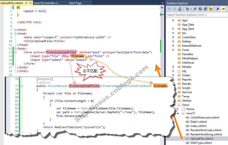 创建一个控制,一个视图操作,一个操作是处理上传文件方法: