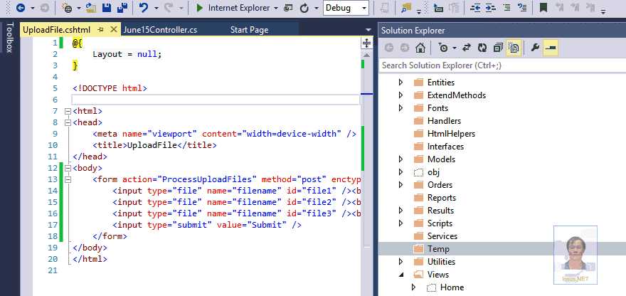 public ActionResult UploadFile() { return View(); } [HttpPost] public ActionResult ProcessUploadFiles(IEnumerable<HttpPostedFileBase> filename) { foreach (var file in filename) { if (file.ContentLength > 0) { var fileName = Path.GetFileName(file.FileName); var path = Path.Combine(Server.MapPath("~/Temp"), fileName); file.SaveAs(path); } } return RedirectToAction("UploadFile"); }