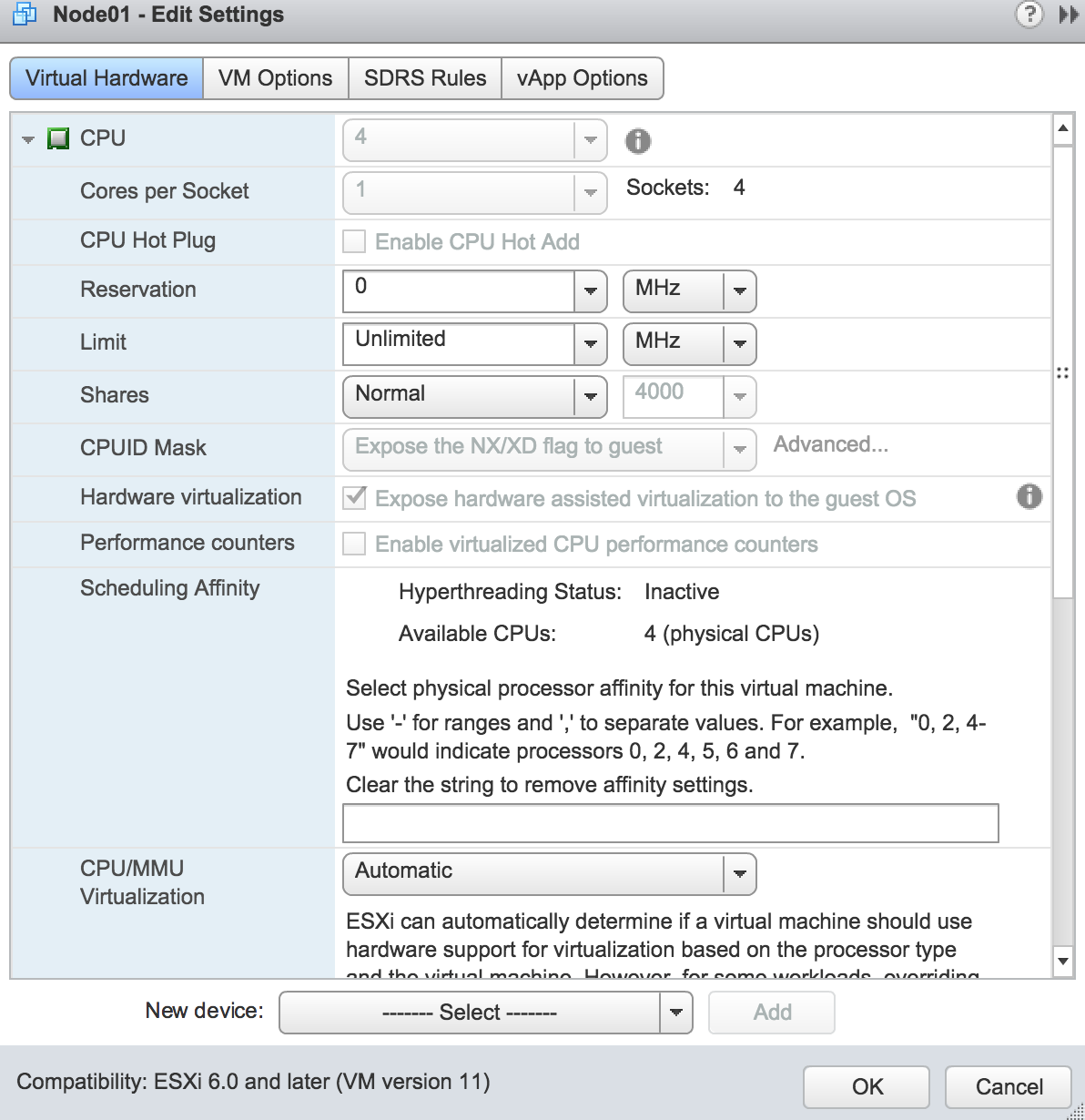 2. Create VM - From the beginning , I thought in a nest environment . So I choose the VM type as ESXi6 . But I got kernel panic when I tried to install Nutanix CE. Then suddenly I think Nutanix original base is linux base, so I choose Centos4/5/6 as my VM OS type . Then the kernel panic issue gone. At least 4 vCPU and 16 GB RAM.