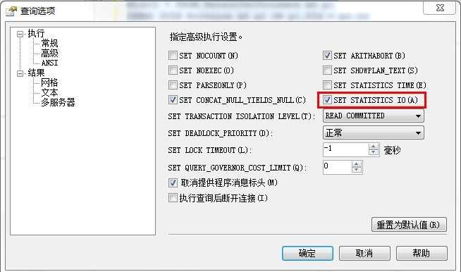 查询=》查询选项=》设置STATISTICS IO: