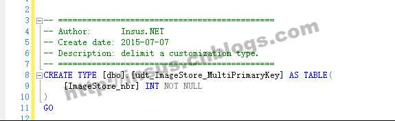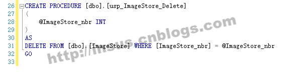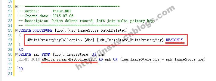 ALTER PROCEDURE [dbo].[usp_ImageStore_batchDelete] ( @MultiPrimaryKeyString NVARCHAR(MAX) ) AS DELETE img FROM [dbo].[ImageStore] AS img RIGHT JOIN [dbo].[udf_SplitStringToTable](@MultiPrimaryKeyString,‘,‘) AS mpk ON (img.ImageStore_nbr = mpk.Value)