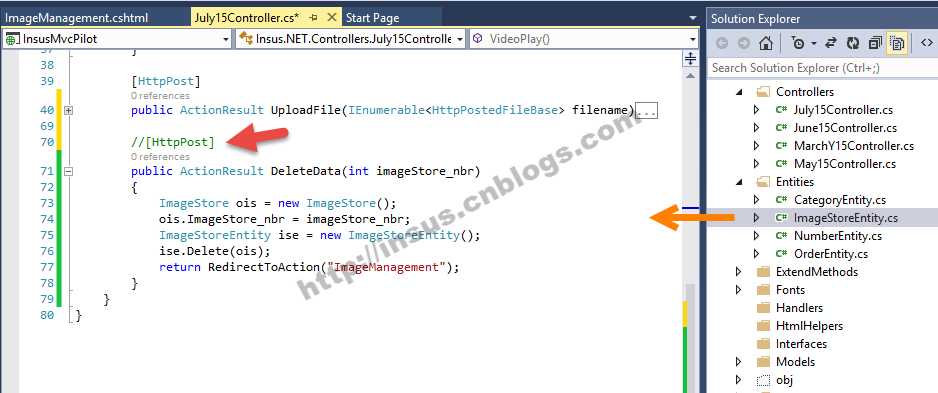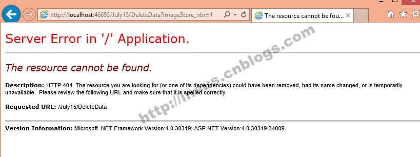 在#70代码中,由于我们使用链接来实现删除,没有post数据,因此操作不使用属性HttpPost。如果你使用的话,删除会有异常:The resource cannot be found.
