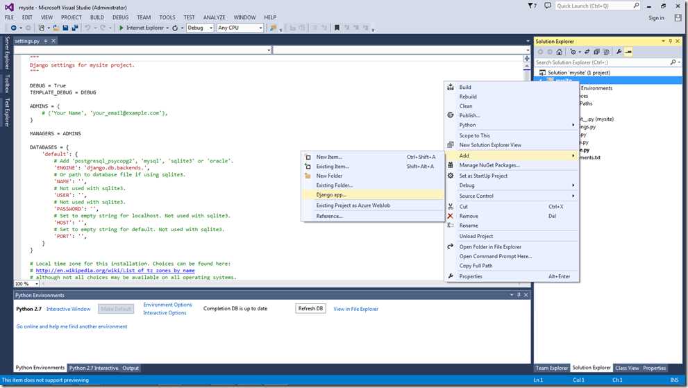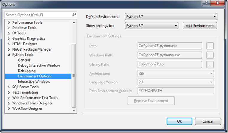 安装完成PTVS后,我们在IDE中检查一下Python的运行环境,接下来我们就可以创建Django的工程了。