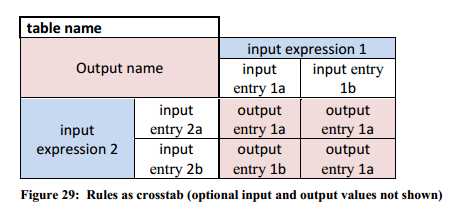根据大小,决策表可呈水平方向(行规则)、垂直(列规则)或交叉表(从两个输入维度组成的规则)。交叉表只能有默认的命中策略(见下文)。