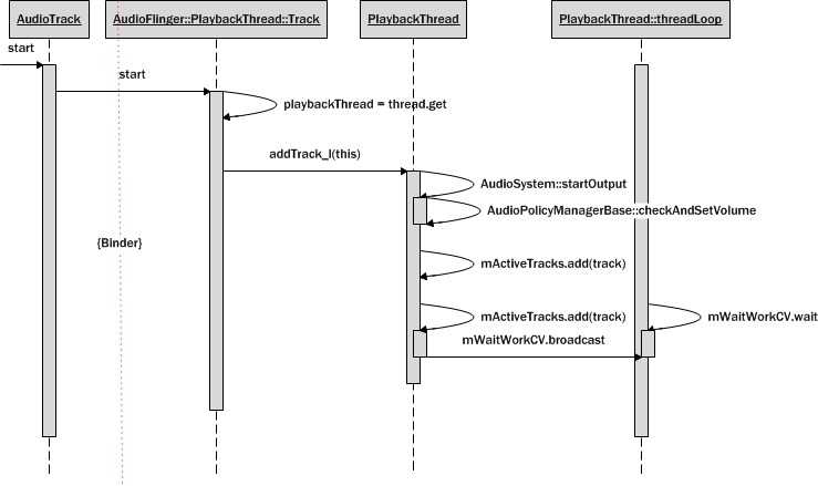 由于我们是在PlaybackThread下进行音频输出的,因此会进一步调用到PlaybackThread::Track:: start方法,其中最主要的是下面两个步骤: