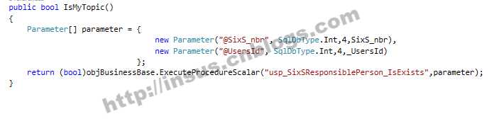 在数据库返回值来看,存储过程只返回数据类型bit了,“1” 和“0”。现在我们在C#程序中应用这个存储过程: