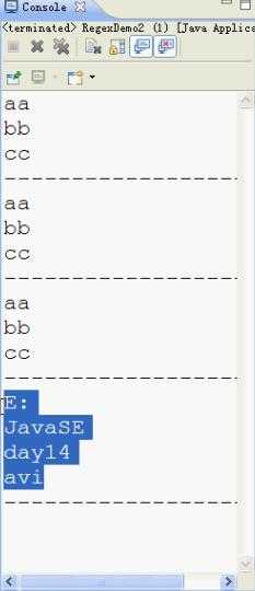 1 package cn.itcast_03; 2 3 /* 4 * 分割功能练习 5 */ 6 public class RegexDemo2 { 7 public static void main(String[] args) { 8 // 定义一个字符串 9 String s1 = "aa,bb,cc"; 10 // 直接分割 11 String[] str1Array = s1.split(","); 12 for (int x = 0; x < str1Array.length; x++) { 13 System.out.println(str1Array[x]); 14 } 15 System.out.println("---------------------"); 16 17 String s2 = "aa.bb.cc"; 18 String[] str2Array = s2.split("\\."); 19 for (int x = 0; x < str2Array.length; x++) { 20 System.out.println(str2Array[x]); 21 } 22 System.out.println("---------------------"); 23 24 String s3 = "aa bb cc"; 25 String[] str3Array = s3.split(" +"); 26 for (int x = 0; x < str3Array.length; x++) { 27 System.out.println(str3Array[x]); 28 } 29 System.out.println("---------------------"); 30 31 //硬盘上的路径,我们应该用\\替代\ 32 String s4 = "E:\\JavaSE\\day14\\avi"; 33 String[] str4Array = s4.split("\\\\"); // 这里‘\\‘ 表示‘\‘ ,所以‘\\\\‘表示‘\\‘ 34 for (int x = 0; x < str4Array.length; x++) { 35 System.out.println(str4Array[x]); 36 } 37 System.out.println("---------------------"); 38 } 39 }