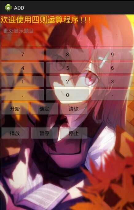 1 <LinearLayout xmlns:android="http://schemas.android.com/apk/res/android" 2 android:layout_width="fill_parent" 3 android:layout_height="fill_parent" 4 android:orientation="vertical" 5 android:background="@drawable/a1" 6 > 7 8 <TextView 9 android:id="@+id/xs1" 10 android:layout_width="wrap_content" 11 android:layout_height="wrap_content" 12 13 android:singleLine="true" 14 android:ellipsize="marquee" 15 android:focusable="true" 16 android:focusableInTouchMode="true" 17 18 android:text="欢迎使用四则运算程序 ! ! !" 19 android:textColor="#ffd700" 20 android:textSize="28sp" > 21 22 <requestFocus /> 23 </TextView> 24 25 <EditText 26 android:hint="此处显示题目" 27 android:id="@+id/xs" 28 android:layout_width="wrap_content" 29 android:layout_height="wrap_content" 30 android:ems="20" 31 android:focusable="false" 32 33 > 34 35 <requestFocus /> 36 </EditText> 37 38 39 40 41 <EditText 42 android:id="@+id/result" 43 android:layout_width="match_parent" 44 android:layout_height="wrap_content" 45 android:cursorVisible="false" 46 android:digits="1234567890." 47 android:ems="20" 48 android:focusable="false" 49 android:numeric="decimal" 50 android:singleLine="true" /> 51 52 <TableLayout 53 android:layout_width="fill_parent" 54 android:layout_height="wrap_content" 55 android:stretchColumns="0,1,2,3" > 56 57 <TableRow> 58 59 <Button 60 android:id="@+id/btn_1" 61 android:text="7" /> 62 63 <Button 64 android:id="@+id/btn_2" 65 android:text="8" /> 66 67 <Button 68 android:id="@+id/btn_3" 69 android:text="9" /> 70 </TableRow> 71 72 <TableRow> 73 74 <Button 75 android:id="@+id/btn_4" 76 android:text="4" /> 77 78 <Button 79 android:id="@+id/btn_5" 80 android:text="5" /> 81 82 <Button 83 android:id="@+id/btn_6" 84 android:text="6" /> 85 </TableRow> 86 87 <TableRow> 88 89 <Button 90 android:id="@+id/btn_7" 91 android:text="1" /> 92 93 <Button 94 android:id="@+id/btn_8" 95 android:text="2" /> 96 97 <Button 98 android:id="@+id/btn_9" 99 android:text="3" /> 100 </TableRow> 101 102 <TableRow> 103 104 <Button 105 android:id="@+id/btn_dot" 106 android:text="." /> 107 108 <Button 109 android:id="@+id/btn_0" 110 android:text="0" /> 111 112 <Button 113 android:id="@+id/btn_10" 114 android:text="-" /> 115 </TableRow> 116 </TableLayout> 117 118 <TableLayout 119 android:layout_width="match_parent" 120 android:layout_height="wrap_content" > 121 122 <TableRow 123 android:id="@+id/tableRow1" 124 android:layout_width="wrap_content" 125 android:layout_height="wrap_content" > 126 127 <Button 128 android:id="@+id/start" 129 android:layout_width="105.0dip" 130 android:layout_height="50.0dip" 131 android:text="开始" /> 132 133 <Button 134 android:id="@+id/btn_eq" 135 android:layout_width="105.0dip" 136 android:layout_height="50.0dip" 137 android:text="确定" /> 138 139 <Button 140 android:id="@+id/btn_clear" 141 android:layout_width="105.0dip" 142 android:layout_height="50.0dip" 143 android:text="清除" /> 144 145 </TableRow> 146 147 <TableRow 148 android:id="@+id/tableRow2" 149 android:layout_width="wrap_content" 150 android:layout_height="wrap_content" > 151 152 <TextView 153 android:id="@+id/textView1" 154 android:layout_width="wrap_content" 155 android:layout_height="wrap_content" 156 android:text="" /> 157 158 </TableRow> 159 160 <TableRow 161 android:id="@+id/tableRow3" 162 android:layout_width="wrap_content" 163 android:layout_height="wrap_content" > 164 165 <TextView 166 android:id="@+id/textView2" 167 android:layout_width="wrap_content" 168 android:layout_height="wrap_content" 169 android:text="" /> 170 171 </TableRow> 172 173 <TableRow 174 android:id="@+id/tableRow4" 175 android:layout_width="wrap_content" 176 android:layout_height="wrap_content" > 177 178 <Button 179 android:id="@+id/music1" 180 android:layout_width="wrap_content" 181 android:layout_height="wrap_content" 182 android:text="播放" /> 183 184 <Button 185 android:id="@+id/music3" 186 android:layout_width="wrap_content" 187 android:layout_height="wrap_content" 188 android:text="暂停" /> 189 190 <Button 191 android:id="@+id/music2" 192 android:layout_width="wrap_content" 193 android:layout_height="wrap_content" 194 android:text="停止" /> 195 196 </TableRow> 197 </TableLayout> 198 199 200 </LinearLayout>