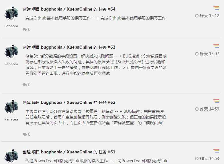 ü 【#60】完成Github的基本使用手册的初稿撰写(100%):完成和数据组的部分数据对接工作,但部分数据由于特殊字段的设置存在插入失败的情况,此问题发布新Issues进行解决和说明 ü 【#61】沟通PowerTeam团队完成Solr数据的插入工作(100%) |
