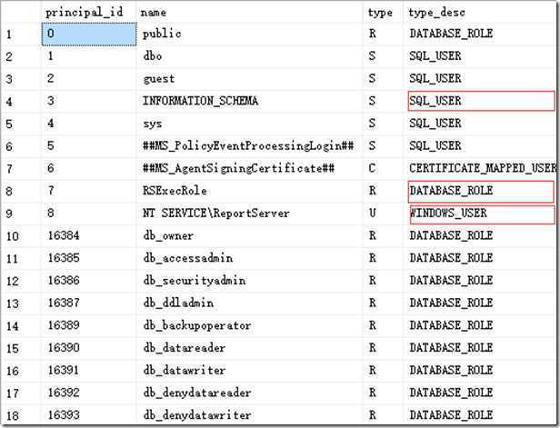 select principal_id, name, type, type_desc from sys.database_principals,视图说明:https://msdn.microsoft.com/zh-cn/library/ms187328(v=sql.120).aspx