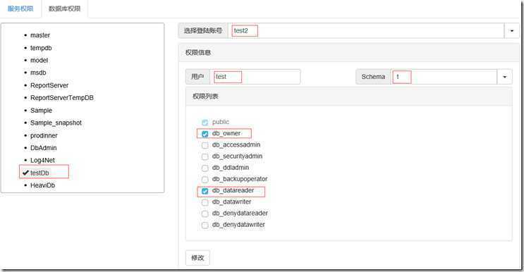 通过对比可以看出,testDb下登录账号test2的用户、默认架构以及数据库角色和我们权限管理系统查询结果完全一致。