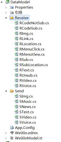 对所有微信发来的消息进行封装, 在datamodel中建一个Receive文件夹和一个send文件夹,在其中分别建立对应消息的类,完成之后,完整的datamodel类库如下图: