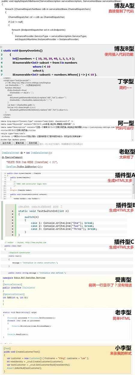 博友B型:受到博客园的熏陶,使用博客园“插入代码”功能,好好的代码弄成了啥样,高亮显示不健全还弄个灰色div包裹着,还显示了行号太不雅了。