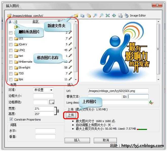 我觉得CuteEditor编辑器的管理图片功能比较强大,可以自由管理、上传自己的图片(这就要不时的切换编辑器了),推荐大家使用CuteEditor来上传图片,然后在Windows Live Writer中插入图片是来引用地址,不建议使用Windows Live Writer自动提交上传图片功能,这样图片地址、图片名称不容易控制,另外它还自动生成一个图片缩略图即一张图片在服务器上生成两张,这无疑浪费了博客园空间资源。
