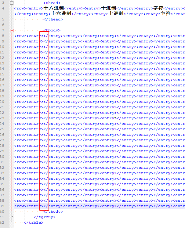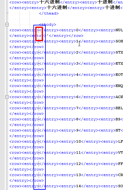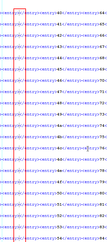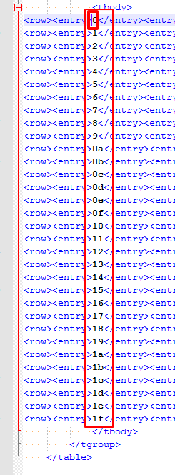 即,0到9列,是可以正确的选择了两个"<entry>"中间的,但是0a到1f的列,却都选择了y和>之间了,位置错了。