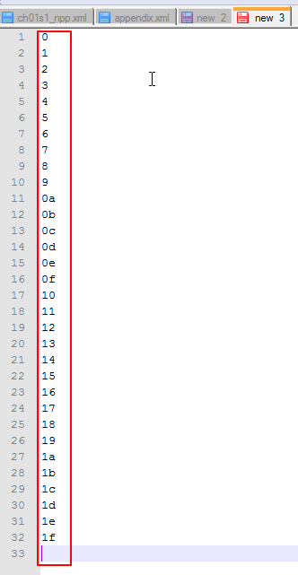 以及0a到1f的行,是正常选取的全部内容,不包含空白的。 而粘贴出来的效果,可以看到,对应的0到9的行,是没有多余的空格,是一个字符的宽度的,没有被变成2个字符的宽度: