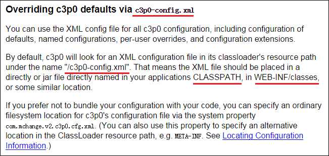 先说配置文件里使用的参数关键字,这个可以由ComboPooledDataSource对象中的各种set方法得到,比如这个对象中的setDriverClass方法,那么使用配置文件的话配置数据库驱动类的参数即为driverClass。另一种参看C3P0配置参数的方式就是看上面曾经说过的C3P0的包中【doc】目录下的index.html文档,在这个文档找到附录B(Appendix B:Configuration Files)有如下配置参数: