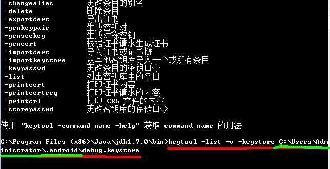 其中keytool为jdk自带工具;keystorefile为Android 签名证书文件