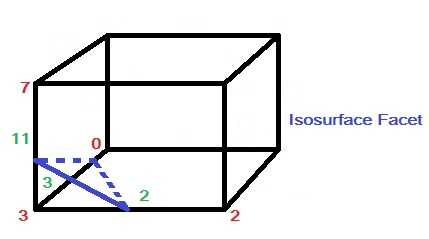 每个体素单元上顶点和边的索引规则如下图左所示,假如体素下方的顶点3的值小于等值面值,其他顶点上的值都大于等值面值(如下图右所示),那么我们可以生成一个与体素边2,3,11相交的三角面片,而三角面片顶点的具体位置则需要根据等值面值和边顶点3-2,3-0,3-7的值线性插值计算得到。