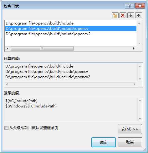 包含目录添加:(找到opencv的路径,我的放在D盘program file的文件夹里,只需要添加三个,最上面的include三个)