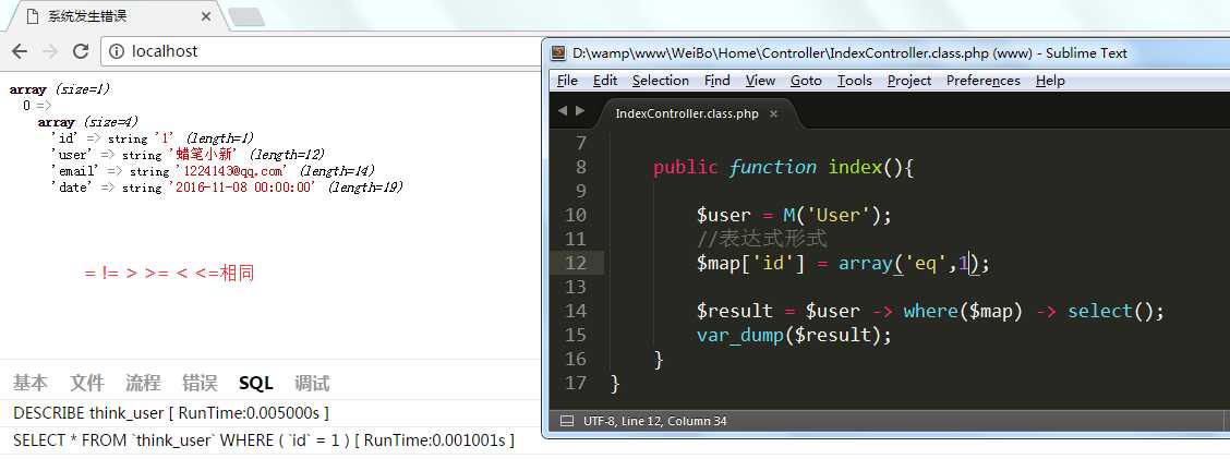 1 $user = M(‘User‘); 2 //快捷方式 3 $map[‘id&user‘] = array(array(‘NEQ‘,1),array(‘EQ‘,1),‘_multi‘=>true); 4 $result = $user -> where($map) -> select(); 5 var_dump($result);