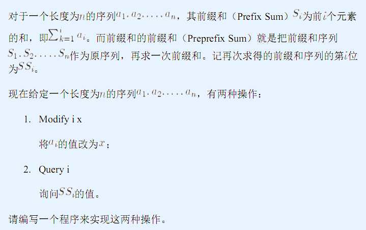 #include<bits/stdc++.h> using namespace std; #define MAXN 100001 typedef long long LL; int n,m,a[MAXN]; LL delta[MAXN<<2],sum[MAXN<<2],S[MAXN]; void read(int &x,char ch=getchar()) { for (;ch<‘0‘ || ch>‘9‘;ch=getchar()); for (x=0;ch>=‘0‘ && ch<=‘9‘;ch=getchar()) x=(x<<1)+(x<<3)+ch-‘0‘; } void build(int s,int l,int r) { int mid=(l+r)/2; if (l==r) return sum[s]=(LL)S[l],void(); build(s*2,l,mid),build(s*2+1,mid+1,r),sum[s]=sum[s*2]+sum[s*2+1]; } void pushdown(int s,int l,int r) { int mid=(l+r)/2; if (!delta[s]) return; sum[s*2]+=delta[s]*(LL)(mid-l+1),sum[s*2+1]+=delta[s]*(LL)(r-mid),delta[s*2]+=delta[s],delta[s*2+1]+=delta[s],delta[s]=0; } LL query(int s,int l,int r,int x,int y) { int mid=(l+r)/2; LL ans=0; if (x<=l && y>=r) return sum[s]; pushdown(s,l,r); if (x<=mid) ans+=query(s*2,l,mid,x,y); if (y>mid) ans+=query(s*2+1,mid+1,r,x,y); return ans; } void insert(int s,int l,int r,int x,int y,int z) { int mid=(l+r)/2; if (x<=l && y>=r) return sum[s]+=(LL)z*(r-l+1),delta[s]+=(LL)z,void(); pushdown(s,l,r); if (x<=mid) insert(s*2,l,mid,x,y,z); if (y>mid) insert(s*2+1,mid+1,r,x,y,z); sum[s]=sum[s*2]+sum[s*2+1]; } int main() { int i,x,y; char s[10]; //freopen("3155.in","r",stdin),freopen("3155.out","w",stdout); read(n),read(m); for (i=1;i<=n;++i) read(a[i]),S[i]=S[i-1]+(LL)a[i]; build(1,1,n); while (m--) { scanf("%s",s),read(x); if (s[0]==‘M‘) read(y),insert(1,1,n,x,n,y-a[x]),a[x]=y; else printf("%lld\n",query(1,1,n,1,x)); } return 0; }